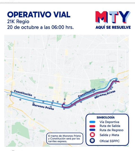 Los corredores tomarán por la calle Zuazua en sentido contrario para ingresar a la Vía Deportiva por los carriles exprés de Morones Prieto y regresan con ese mismo recorrido para llegar a la meta que se ubicará en el mismo punto de partida.